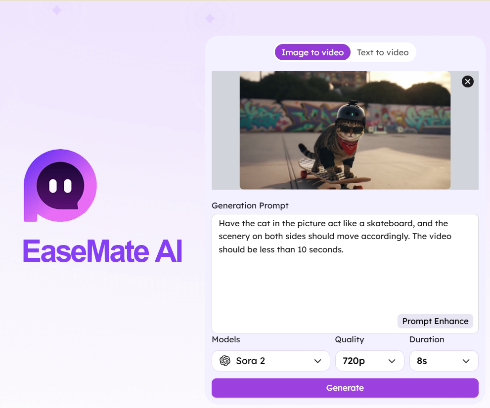 Another simple way to free access to the model is to use Sora 2 AI video generators via web platforms, such as EaseMate AI. It’s an all-in-one AI video generator that can easily animate any text and control every shot easily with the free Sora 2 AI model.