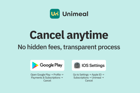 If you’d rather not cancel through the app, you can always reach out to in-app support or send an email to support@unimeal.com. We did that one and got a helpful response from the support team within 24 hours, with the cancellation confirmed shortly after that.