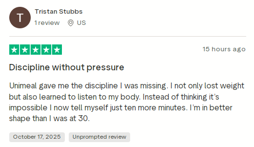 - TrustPilot features Tristan Stubbs from the USA, sharing his user story, describing newfound discipline achievements. Weight loss combined with body awareness improved his mindset significantly. His current shape surpasses his fitness level at age 30 remarkably.